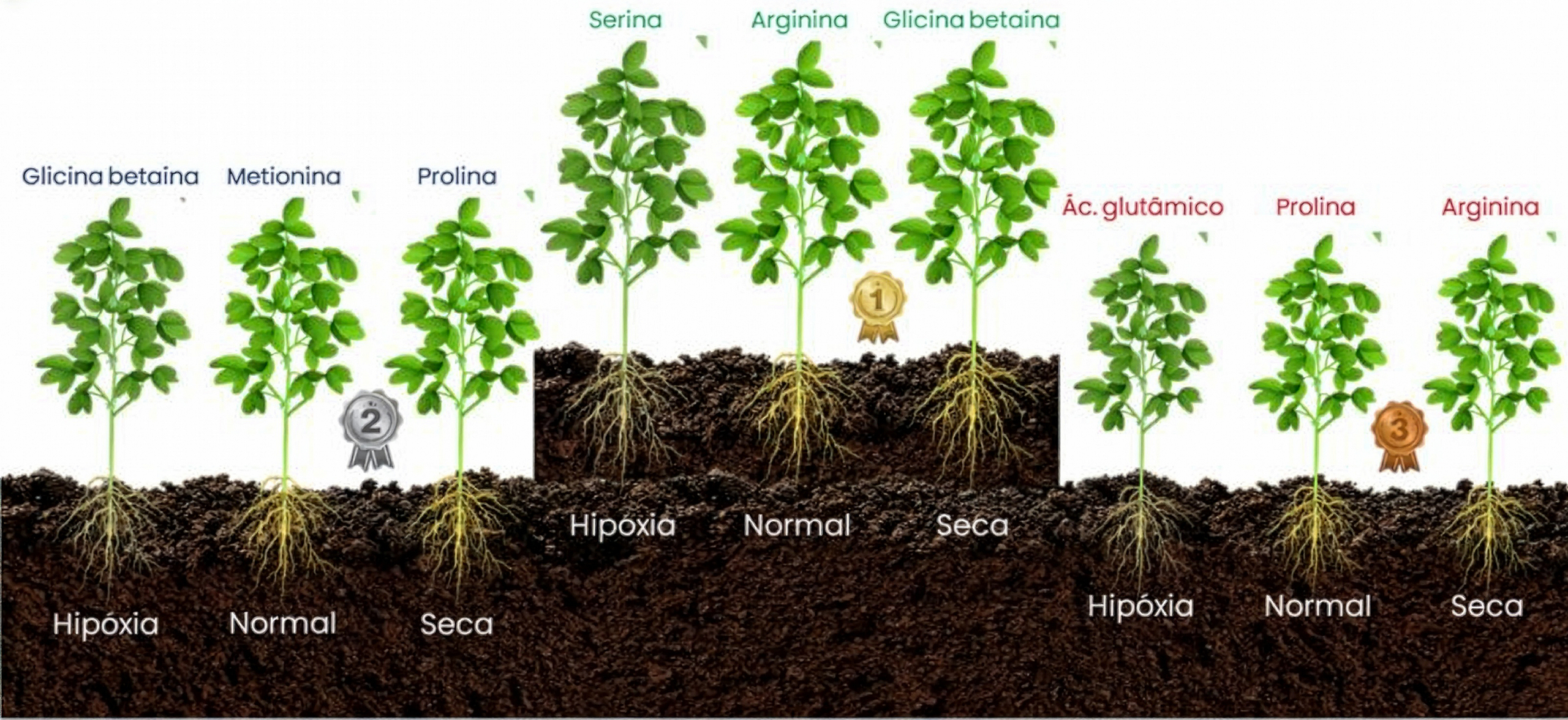 Isoladamente, verificamos que o composto quaternário glicina betaína foi o mais frequente em incremento de produtividade em comparação aos aminoácidos. Contudo, a serina é um aminoácido muito importante para a produção de glicina betaína na planta e, no ambiente de hipóxia, é o aminoácido que mais impacta na produtividade. Assim, em áreas com excesso de chuva ou falta de oxigênio no solo, a adoção da serina substitui a glicina betaína.